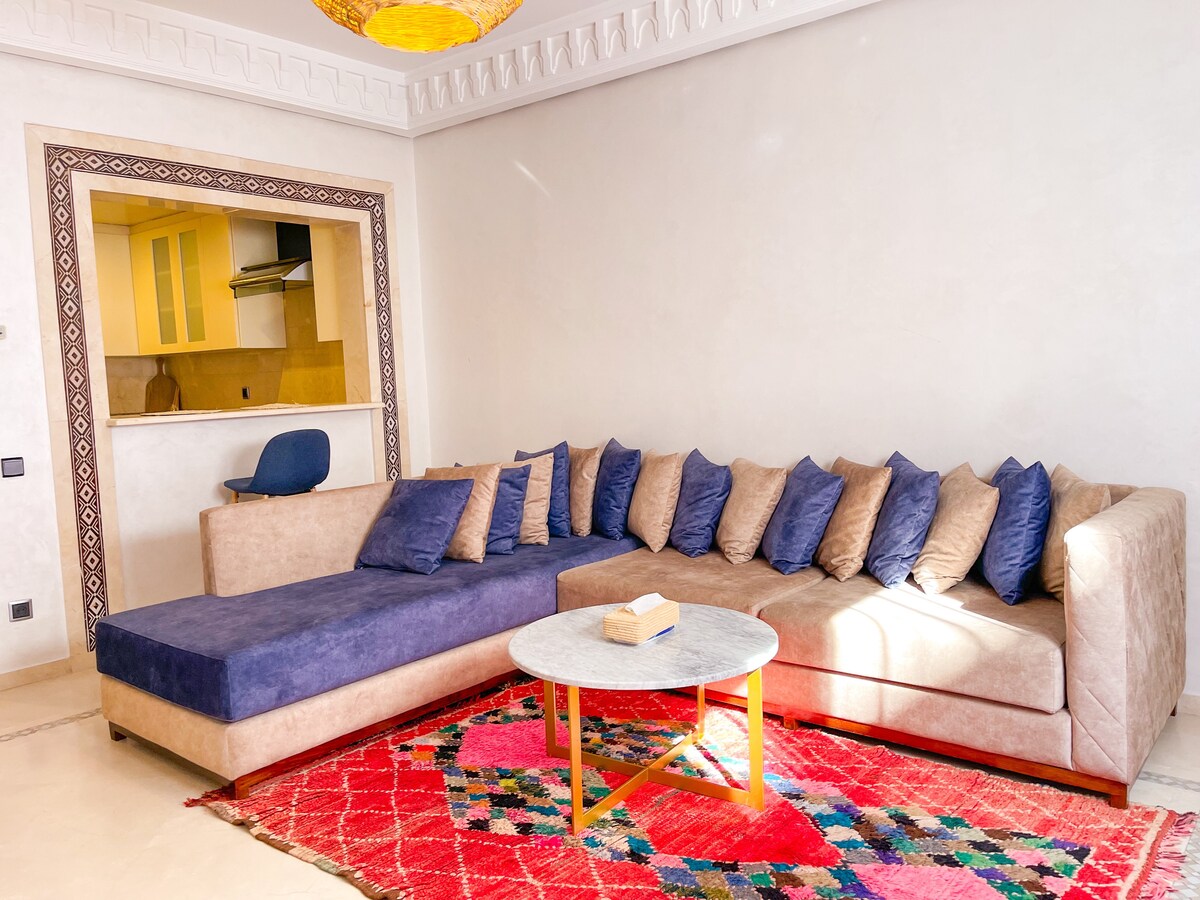 Un appart tout confort - Résidence neuve avec ascenseur et accès sécurisé - Appart fonctionnel, moderne et joliment décoré - Clim, Wi-Fi, TV ... pour un séjour agréable 🏊♂️ Les atouts de votre séjour - Piscine en rooftop avec vue dégagée, idéale pour vous détendre après vos journées de visite - Quartier central et animé, parfait pour découvrir Marrakech - A proximité immédiate des commerces, et lieux de vie 📌 À savoir Nous respectons la législation marocaine (voir règlement intérieur).