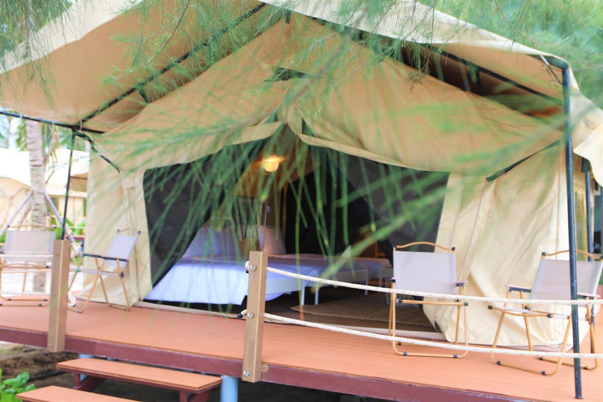 This marvelous glamping tent will give you the most memorable memory. Spacious apx. 13 sqm high standard bell-tent equipped with a hotel-rated king size mattress, fully functioning air-conditioner, private timber decking over looking the serene lake. This tent is perfect for couple who loves to emerge in nature while still enjoy comfortable amenities. Toilets and showers are shared. 10 toilet cubicles and 10 shower rooms are divided into 2 buildings - very short-walking distance from all tents