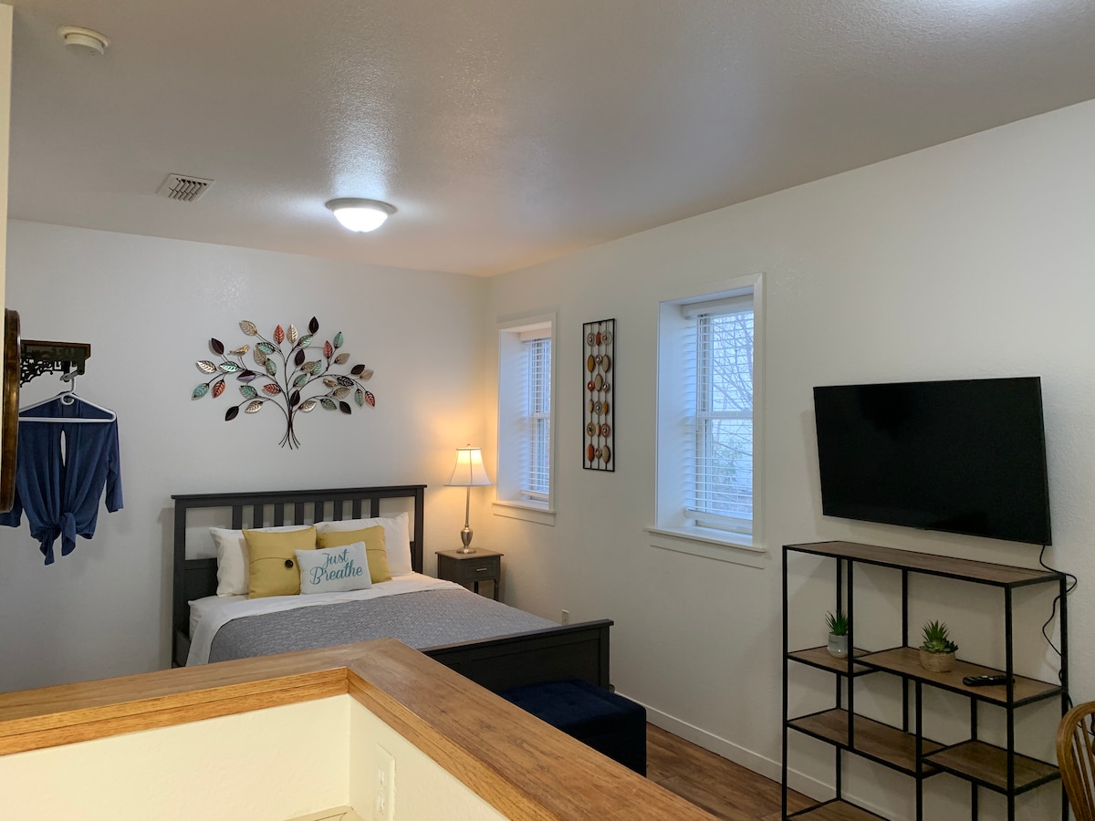 This is a 500sqft studio apartment. We have 3 units that on the 2nd floor of our business in Downtown Marysville. Unit B is the middle apartment and is great for short stays. We have a queen bed, small couch, and a 43" TV in the living area. There is also a full size kitchen, dining table and private bathroom in the apartment. We offer our guests wifi, Hulu live TV, coffee, and a comfortable bed. The space is great for 2 people.