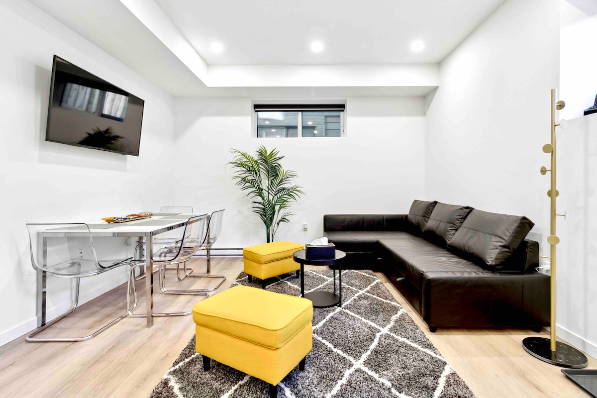 Suite basement 1 kamar tidur & 1 kamar mandi yang nyaman dan modern di atas tanah ini terang dan luas dan menawarkan semua yang Anda butuhkan untuk membuat masa menginap Anda senyaman mungkin. TV 70 inci dengan kabel & Netflix, sofa sectional besar dengan tempat tidur double pull out, Wifi, udara sentral, laundry di dalam suite, seprai berkualitas dengan perlengkapan tempat tidur ekstra. Banyak jendela besar yang memungkinkan banyaknya cahaya alami dan ruang kerja khusus yang menghadap ke halaman belakang. Parkir gratis. Patio pribadi & merokok diperbolehkan di luar ruangan.