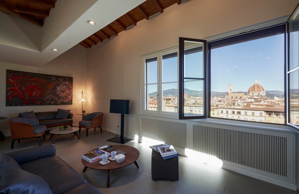 L'appartamento ha una posizione e una vista magnifica sull'Arno, il Corridoio Vasariano e il Ponte Vecchio. Si trova al secondo piano di un edificio nel cuore del centro storico, è stato recentemente ristrutturato per avere ogni comfort ed è stato elegantemente arredato con mobili e lampade di design dal proprietario Giovanni, noto antiquario di design del XX secolo. Un perfetto bilanciamento fra classico e moderno, lusso ed eleganza, design e comfort, minimalismo e cura dei dettagli.