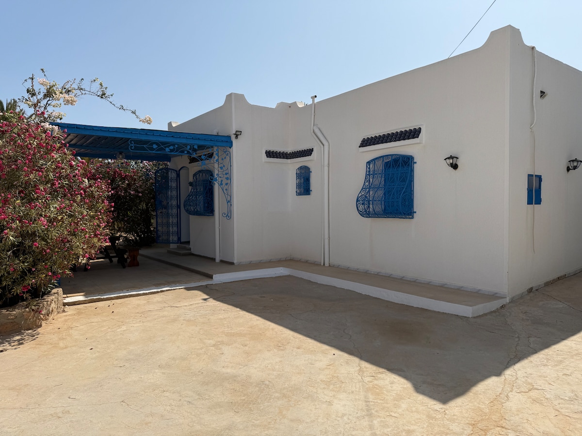 Selain arsitektur khas Djerba, ia menawarkan masa inap yang santai bagi keluarga Terletak di kawasan wisata 1 km dari hotel dan pantai umum Aljazira dengan pagar Tempat ini dilengkapi dengan 2 kamar tidur (tempat tidur double dan 2 tempat tidur single), 2 kamar mandi dengan toilet, ruang tamu besar dengan ruang makan, dapur besar yang lengkap, 3 teras untuk bersantai dan makan di luar, WiFi tanpa batas, saluran TV internasional Toko dan restoran berjarak 500 m Pantai di 1Km Houmt Souk 11 km Midoun berjarak 6 km