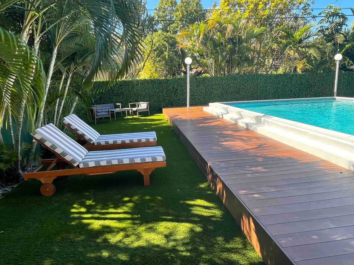 Resor mini yang menakjubkan ini telah dibuat dengan memperhatikan kenyamanan tamu kami. Nikmati halaman dan dek kolam renang yang dirancang dengan banyak tempat duduk luar ruangan dan pondok tiki. Properti ini memiliki rumput sintetis di luar, sangat cocok untuk anak - anak dan keluarga duduk dan bermain. Wifi super cepat. Stopkontak USB di setiap kamar. Tempat tidur yang sangat nyaman. Smart TV yang bisa Anda streaming film favorit Anda ke. Mesin cuci dan Pengering. BBQ luar ruangan. Rumah kami berada Beberapa menit dari pusat kota dan pantai/ boardwalk Hollywood.