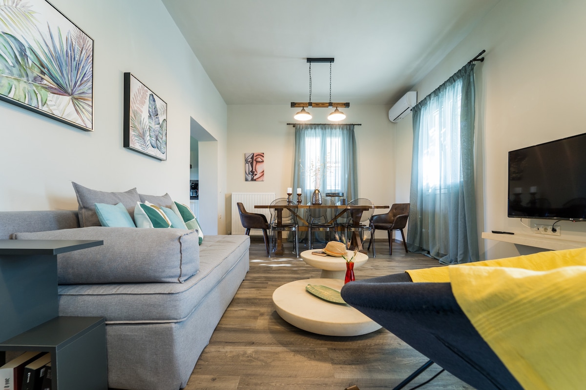 Ammos Suite adalah rumah terpisah 2 kamar tidur modern dengan ruang tamu terbuka, dapur Italia, dan kamar mandi mewah. Pintu kaca besar terbuka ke patio dengan pemandangan laut. Nikmati patio kayu yang menghadap pantai berpasir dan pancuran luar ruangan untuk menyegarkan diri setelah seharian di bawah sinar matahari. Cocok untuk bersantai dan menonton matahari terbenam yang ajaib.