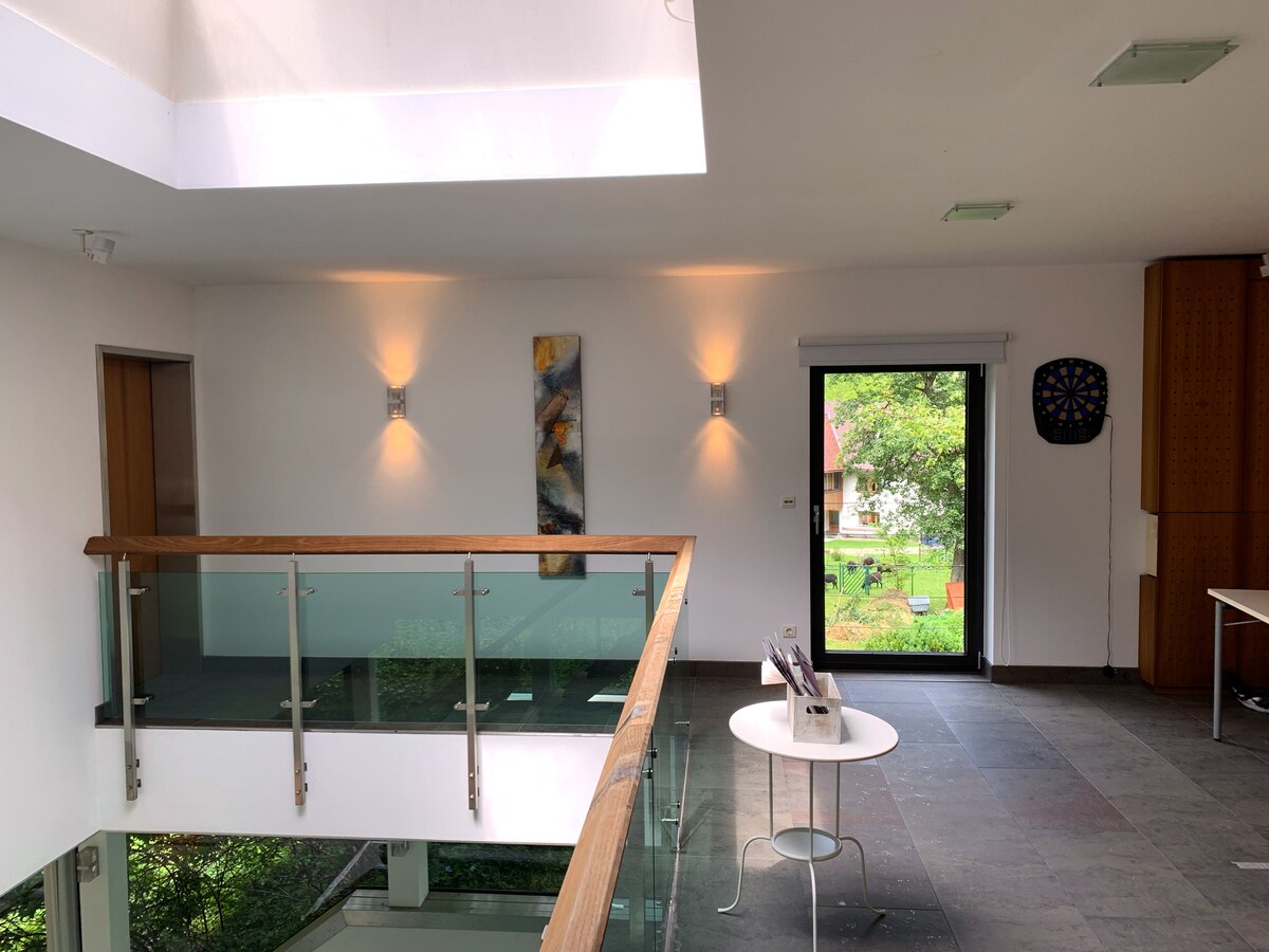 Apartemen kami terletak di atas bukit di distrik Viechtwang dengan pemandangan sungai padang rumput alpine yang indah. Dalam waktu sekitar 500 m ada toko roti untuk keinginan sarapan Anda, Anda menikmati kekaisaran Anda sendiri dengan luas sekitar 35 m2, selain itu Anda memiliki lemari pakaian sendiri di area pintu masuk tepat di depan apartemen. Di luar kami menawarkan taman yang bagus dengan teras dan area barbekyu di bawah pohon kenari yang teduh. Selama bulan-bulan musim dingin, Anda bisa menikmati kedekatan dengan resor ski Kasberg (15 menit).