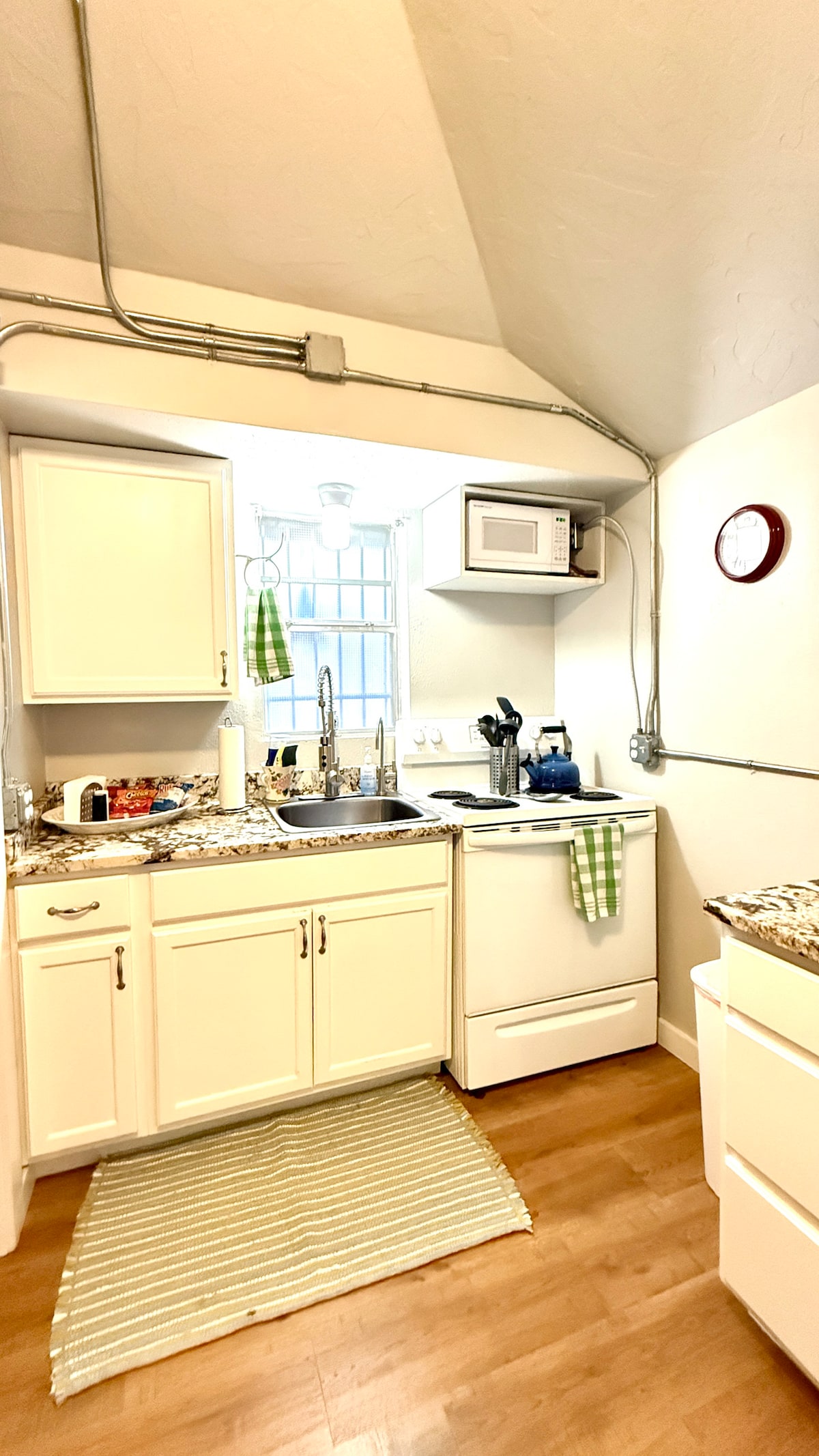 Sampaikan dengan sederhana di tempat yang damai dan berlokasi di pusat ini. Memiliki apa yang Anda butuhkan saat bekerja dan hanya membutuhkan tempat tidur yang tenang dan sejuk. Jaraknya berjalan kaki dari kantor dowtown, restoran, dan bar. Dapur kecil memiliki microwave, kulkas, dan wastafel. Coffee maker k cup style. Beberapa cangkir dan piring juga disertakan.