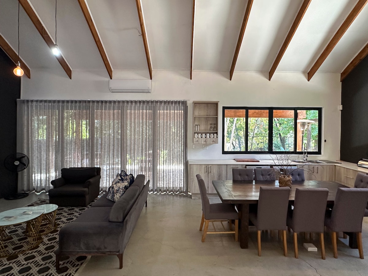 Cocok untuk keluarga, teman, dan profesional yang mencari tempat luar biasa dengan banyak kamar untuk tinggal, bersenang-senang, dan bekerja. Rumah ini memiliki AC Rumah 5 kamar tidur dengan kolam renang, lapa dengan pemanggang barbeku built-in, Wi-Fi tanpa batas, langganan Disney+, Amazon Prime, dan Showmax rumah utama: 3 kamar tidur, 2 kamar mandi, dapur, ruang tamu. Kamar tidur utama memiliki ruang TV pribadi. Cottage: 2 kamar tidur, satu kamar mandi, ruang tamu, dan dapur dengan kompor gas Berjarak 10 menit dari Sandton, Midrand, & Fourways