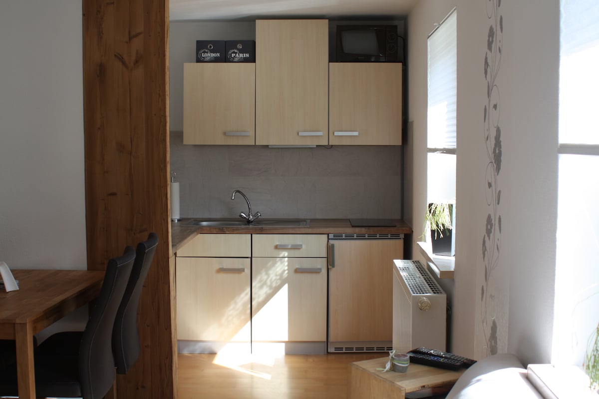 Ein herzliches Glück Auf im Erzgebirge! Unsere Ferienwohnung liegt im Herzen des Erzgebirges und befindet sich im Erdgeschoss einer zum Wohnhaus umgebauten Scheune. Unsere kleine aber schicke und gemütliche Ferienwohnung ist ideal geeignet für 2 Personen. Eine weitere Aufbettung für Kind oder Baby ist problemlos möglich. Die FeWo verfügt über Flur, Wohnzimmer mit Küche, Schlafzimmer, Bad mit Dusche und WC. Selbstverständlich sind ein separater Eingang und ein PKW-Abstellplatz vorhanden.