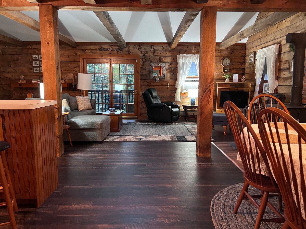 Quiet wooded setting for authentic log cabin: *Self-contained wooded area. Owners live nearby. Other homes visible in winter. *1/2 mile country dirt road passes homes on way to cabin. Please drive slowly! *Signs along road after GPS leaves off. *Parking area turn around. *Complete bathroom *Kitchen: convection oven/ air-fryer/ microwave combo, Keurig, toaster, under counter frig. / small freezer. *Loft queen bed *Double Futon *Pots, pans, utensils *Table service for 4 *Games, books