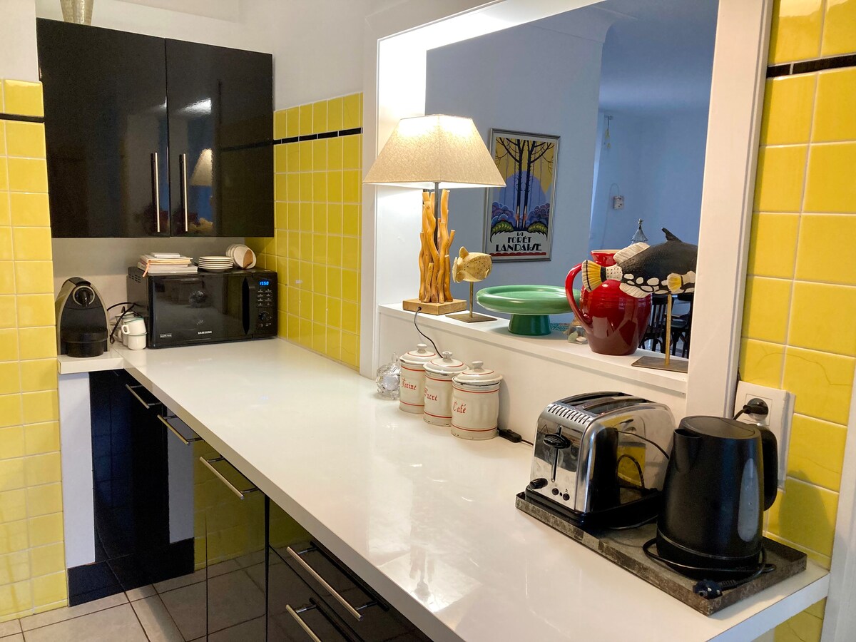 Lupakan kekhawatiran Anda di tempat yang indah ini, terletak di samping rumah pemiliknya tetapi benar - benar independen. Tenang, di pinggir hutan pinus, Anda bisa menikmati kolam renang dari Juni hingga Oktober jika cuaca memungkinkan. Samudra berjarak sekitar 6 km, jalur sepeda membawa Anda ke sana, 500 m dari studio. Pusat desa dan toko - tokonya berjarak 1,5 km namun berjarak 100 m, di seberang jalan Anda akan menemukan Florian the plantler dan produk kebunnya yang bagus serta produk regional.