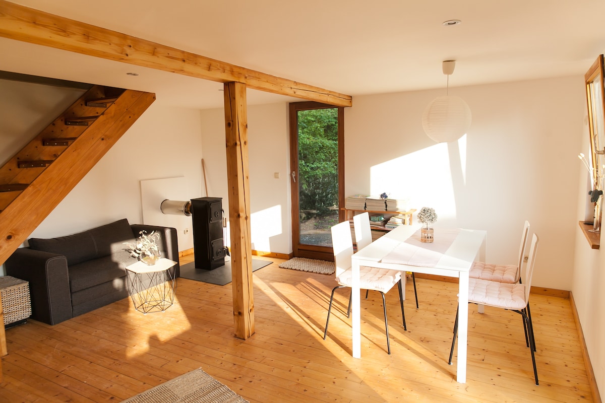 Apartemen seluas 120 meter persegi ini adalah setengah dari rumah pertanian dari tahun 1898 dan telah direnovasi. Dikelilingi oleh ladang, rumah ini berada di lokasi yang terpencil dan sangat cocok untuk menikmati alam dan ketenangan. Ada taman dengan teras ke apartemen dan juga barbekyu yang tersedia atas permintaan. Dari teras selatan Anda bisa melihat di atas sawah ke Wiehngebirge yang berdekatan.