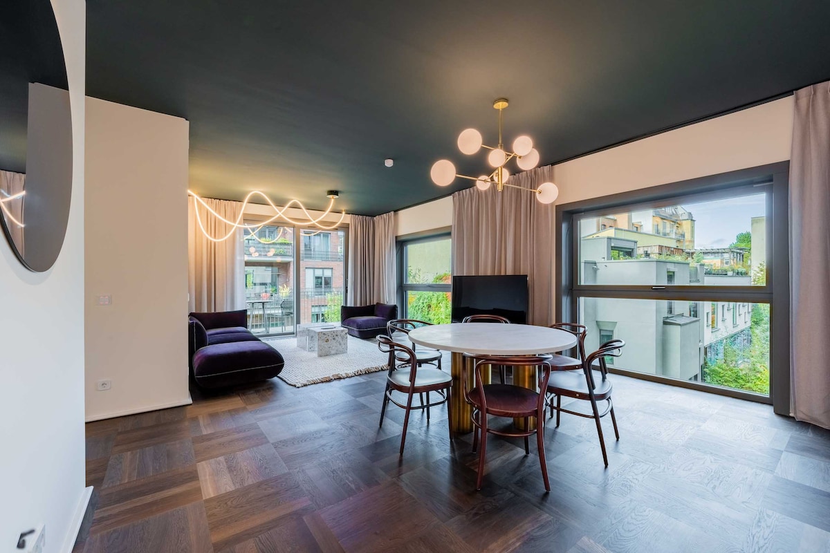 Penthouse dupleks mewah di pusat kota Berlin ini memiliki semua yang Anda butuhkan dan lebih banyak lagi. Apartemen dua kamar tidur seluas 150 meter persegi ini terletak di area terbaik. Restoran lezat, toko desain & pakaian mewah, dan galeri paling sukses dapat ditemukan di sini. Entah Anda ingin tinggal di dalam dan menggantung di salah satu dari dua atap pribadi atau makan dan berjalan - jalan. Hampir tidak ada yang seperti itu.