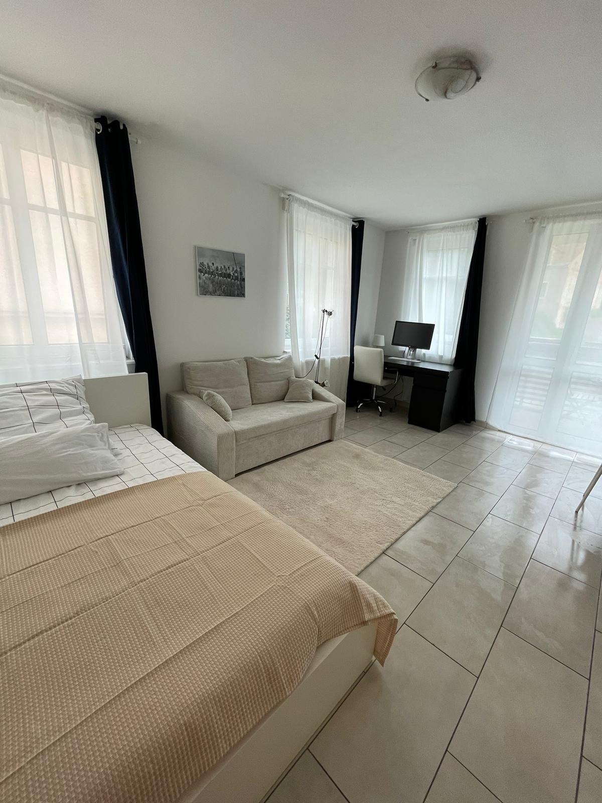 Selamat datang di studio kami yang nyaman di pusat kota Chemnitz! Apartemen ini berada di lantai tiga dan dilengkapi dengan semua peralatan dan furnitur yang diperlukan, termasuk balkon yang luas. Anda memiliki tempat tidur besar dan sofa tarik, TV OLED besar, dapur fungsional dengan oven, mesin kopi dan kulkas, dan kamar mandi modern dengan shower dan mesin cuci. Check - in mandiri dimungkinkan.