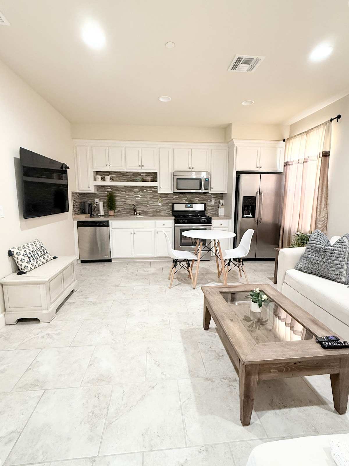 Studio konsep terbuka yang cerah menawarkan segala yang Anda butuhkan untuk masa inap yang mulus: Tempat tidur berukuran Queen yang empuk, dapur lengkap dengan meja granit, kompor lengkap, dan microwave. Kamar mandi modern dengan shower walk - in yang luas. Tempat duduk sofa yang nyaman, TV layar datar, dan Wi-Fi berkecepatan tinggi. Pintu Masuk & Patio Pribadi Penatu di Unit: Mesin cuci dan pengering ukuran penuh. Sistem AC mini-split yang tenang dan bertenaga. Parkir Mudah: Area khusus di kawasan perumahan yang aman dan tenang.