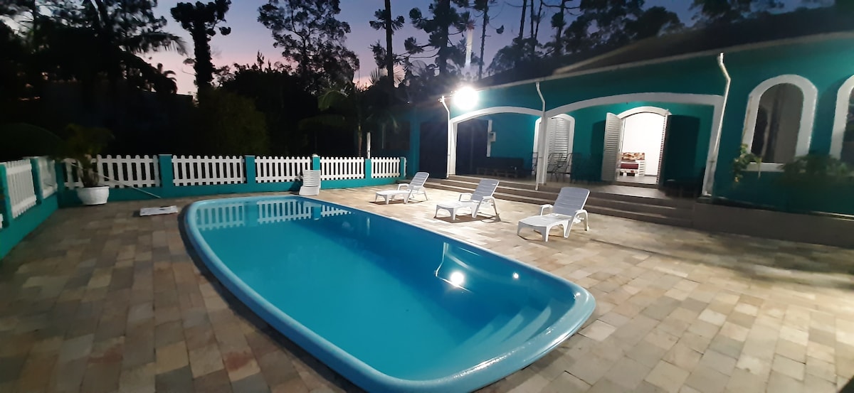 Cocok untuk bersantai bersama keluarga, teman 🏡 Kapasitas untuk hingga 15 tamu 🛁 3 kamar mandi dan 1 kamar mandi 🚗 6 tempat parkir Kolam renang🏊♀️ besar (5x13m dan 1,60 m dalam) 🧖♀️Sauna kering 📶 Wi-Fi dan Netflix Dapur lengkap, dengan 2 filter air. 🥩BBQ Seprai (kualitas premium) Ventilator di kamar tidur dan ruang tamu. Danau Memancing 🐟Olahraga Taman dengan pohon buah-buahan (pitanga, acerola, dll.) Lingkungan ideal untuk beristirahat dan terhubung dengan alam.
