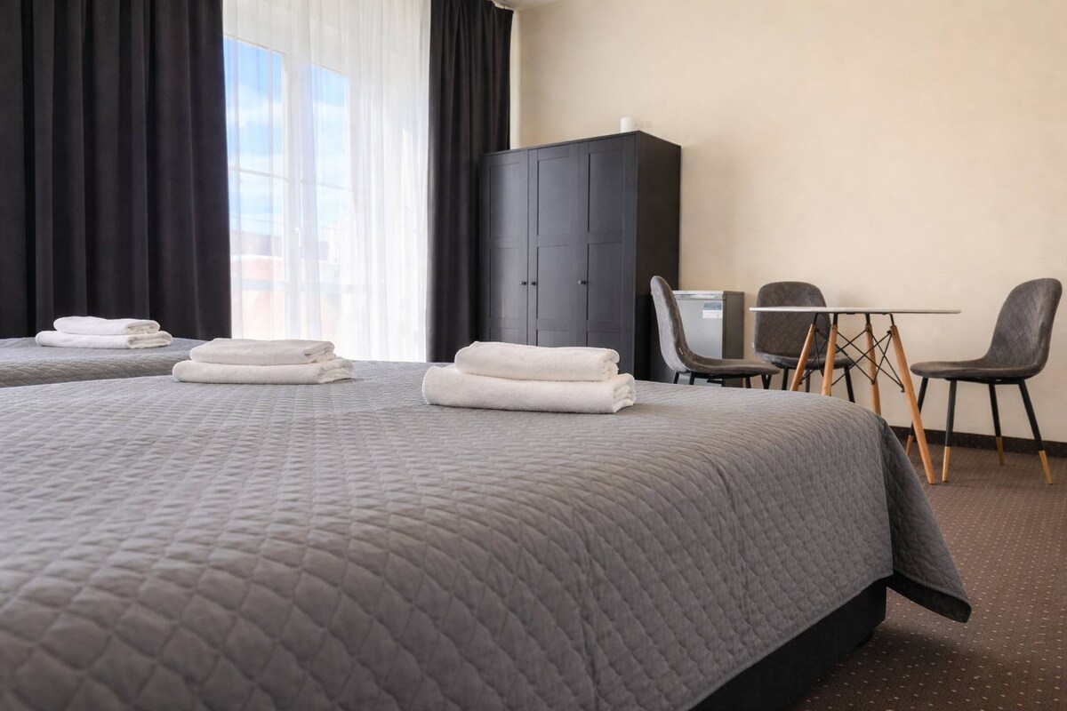 Our Twin Room is 16 m² and features two twin beds, a sitting area, and heating. The private ensuite includes a shower, eco-friendly toiletries, a hair dryer, and fresh towels. Stay connected with free Wi-Fi and unwind with a flat-screen TV with satellite channels. Pet-friendly, and an iron is available on request.