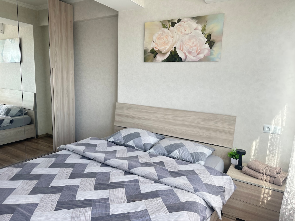 Stay in a stylish, newly built 1-bedroom apartment in a premium residential complex. Located in the city center yet in a peaceful area near a beautiful park, it offers all the amenities for a comfortable stay. Just steps away from a shopping center, bank, panoramic rooftop restaurants, cafés, a gym, a grocery store, and a tanning salon, everything you need is within reach. Perfect for both business and leisure travelers looking for comfort and convenience.
