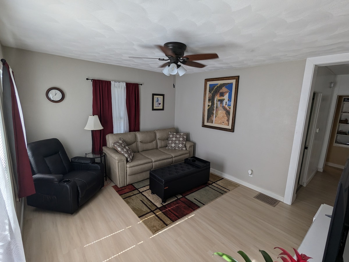 Bersantailah dan bersantailah di tempat yang tenang dan bergaya ini. Kami memiliki 1 kamar tidur dengan tempat tidur queen, smart TV, dan lampu pengisian daya USB. Jangan ragu untuk menyiapkan makanan di dapur lengkap kami atau menyiapkan secangkir kopi. Lokasi ini berada tepat di luar Avenue of the Cities dan dekat dengan toko kelontong, restoran, dan pom bensin.