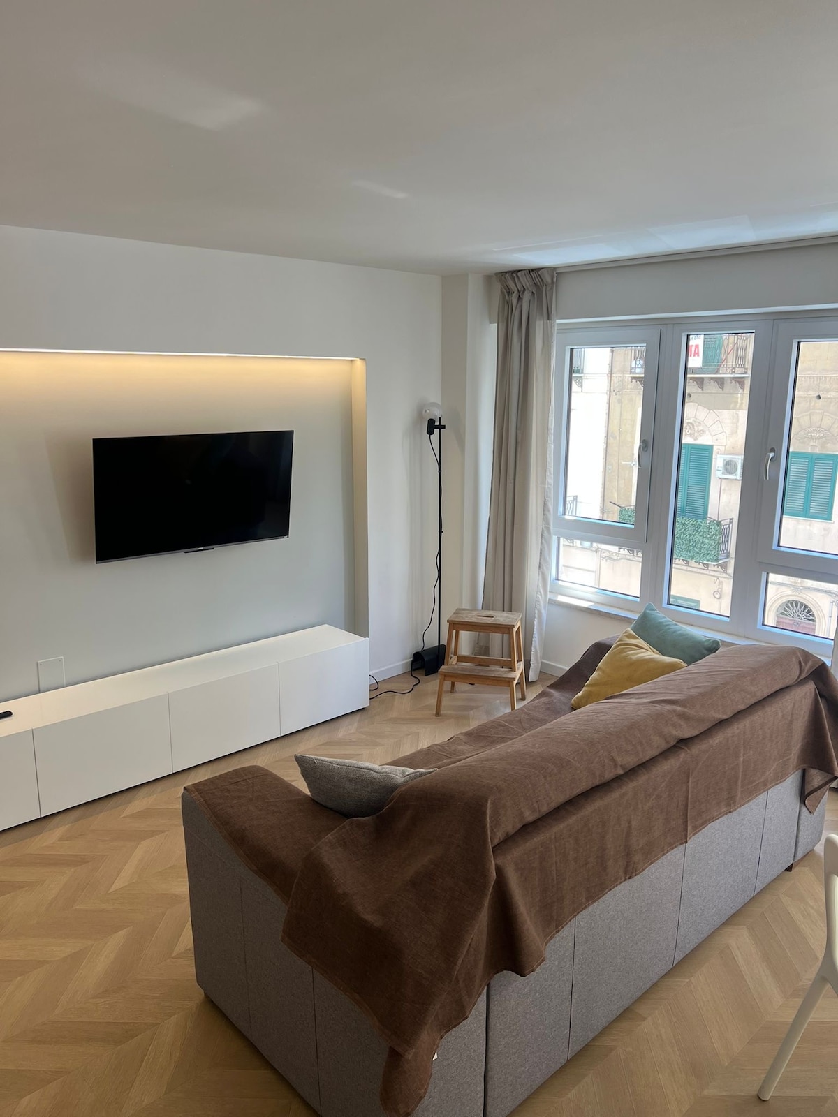 Large and bright apartment with air conditioning in the center of Palermo, a few steps from the main monuments and the train station. The house is very quiet and has 2 bedrooms, 2 bathrooms, a large living room with Smart TV, a mezzanine with work area, a balcony overlooking the city rooftops, a kitchen with coffee machine, kettle, microwave and a laundry room with washing machine and dryer. The Wi-Fi is superfast. CIN. IT082053C22I8BSS7Z