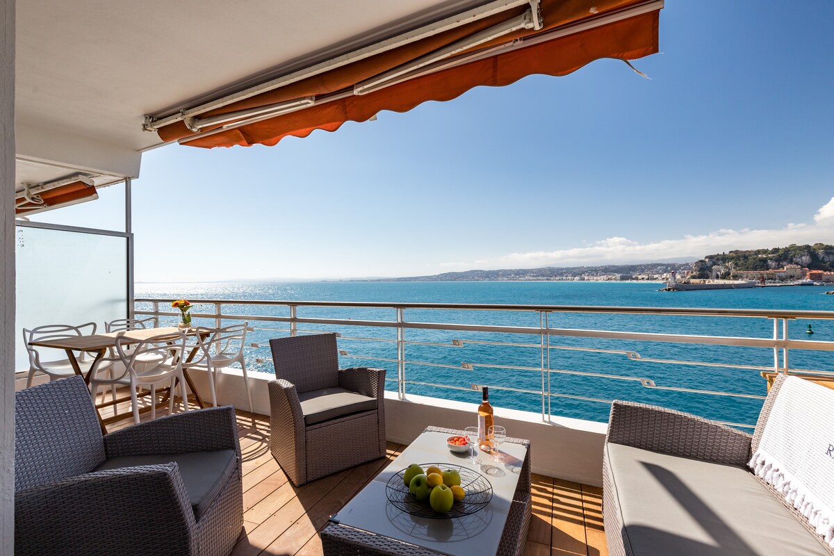 Apartemen luar biasa ini berlokasi di lantai 4 gedung apartemen di Promenade des Anglais, yaitu hanya beberapa langkah dari pantai. Apartemen ini memiliki ruang tamu/ruang makan yang luas dengan dapur terbuka serta 2 kamar tidur, 2 kamar mandi dan teras yang luas. Perabotan bergaya. Balkon yang luas menghadap ke laut dan memiliki matahari (hampir) sepanjang hari. Pusat kota berjarak 15 menit berjalan kaki atau 5 menit dengan trem.