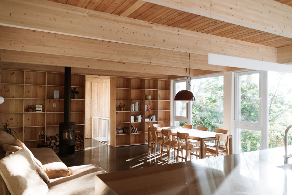 Small Scandinavian chalet for two people ideally located to enjoy the attractions of Charlevoix. It has a thermal circuit (hot tub, sauna, hammam) Very intimate and in the middle of the woods, the view overlooks the majestic river and the mountains in the distance. All the modern equipment is there and the comfort is absolute A/C and outdoor fireplace. The open concept design was designed for an immersive experience in nature: large windows, panoramic shower. Access via a private road at 500 m.