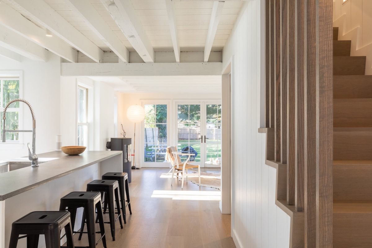 Escape to your chic, serene Hamptons getaway! Near all of the best attractions, nestled in privacy + nature. Relax at your wood-burning fireplace, 80' streaming TV + large Chef's kitchen. Enjoy the chic decor, nature views + natural light from all areas of the house. During summer, swim in your pool, spark up the BBQ + firepit under the starry sky; walk 1 block to waterfront dining, enjoy beaches, Main St. of East Hampton + Amagansett, shopping + coffee all within 3-10 minutes of the house.