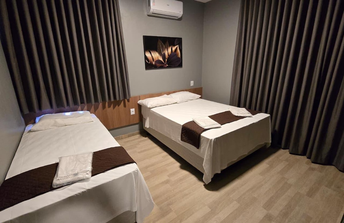 Apartemen ini sangat nyaman, lapang, dan bersih. Tempat ini memiliki kamar tidur ganda dengan AC dan kamar tidur/kantor dengan dua tempat tidur single, meja, dan kursi yang bagus untuk bekerja/belajar. Apartemen ini berlokasi sangat baik, dekat rumah sakit, pusat kebugaran, dan supermarket. Dan juga jalan paling terkenal di Montes Claros dengan beberapa bar, restoran, es krim, pizzeria, barbekyu, dll. Catatan: Garasi tertutup dan dapat menampung kendaraan berukuran kecil dan sedang. Caminhonetes tidak muat.