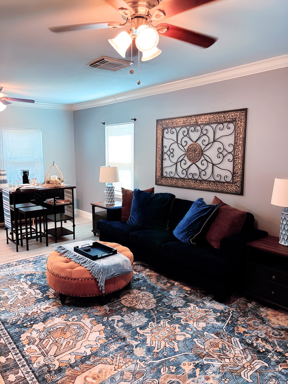 Bersantailah dan bersantailah di tempat yang tenang dan bergaya ini. "Rumah Kecil" tidak terasa begitu kecil. Dapur yang luas dan ruang tamu terbuka memiliki banyak ruang untuk kasur udara jika Anda memiliki lebih dari dua kasur di pesta Anda. Dengan internet Fiber dan WiFi yang tersedia, smart TV di ruang tamu dan kamar tidur membuat dua ruang terpisah yang bagus. Di ruang utilitas terdapat area lemari dengan mesin cuci/pengering yang dapat ditumpuk dan kamar mandi lengkap tepat di seberang lorong untuk kenyamanan.