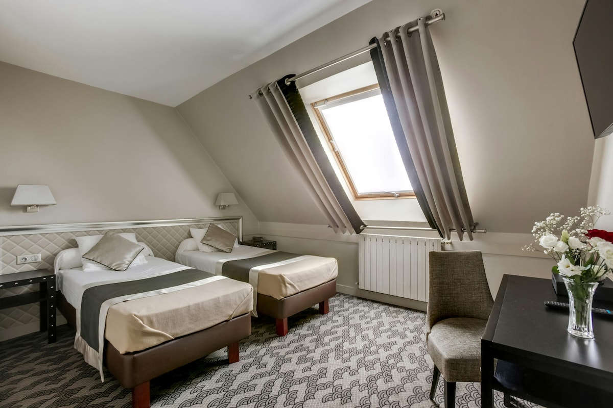 Kamar Standard Twin dengan kamar mandi pribadi di Hotel Palm***, hotel butik bintang 3 Astotel yang berlokasi ideal di pusat arondisemen ke -9 Paris, dekat Montmartre, stasiun kereta Gare de l'Est dan Gare du Nord, dan transportasi umum. Resepsionis 24/7. Kemungkinan setoran bagasi gratis sepanjang hari pada hari kedatangan dan keberangkatan.