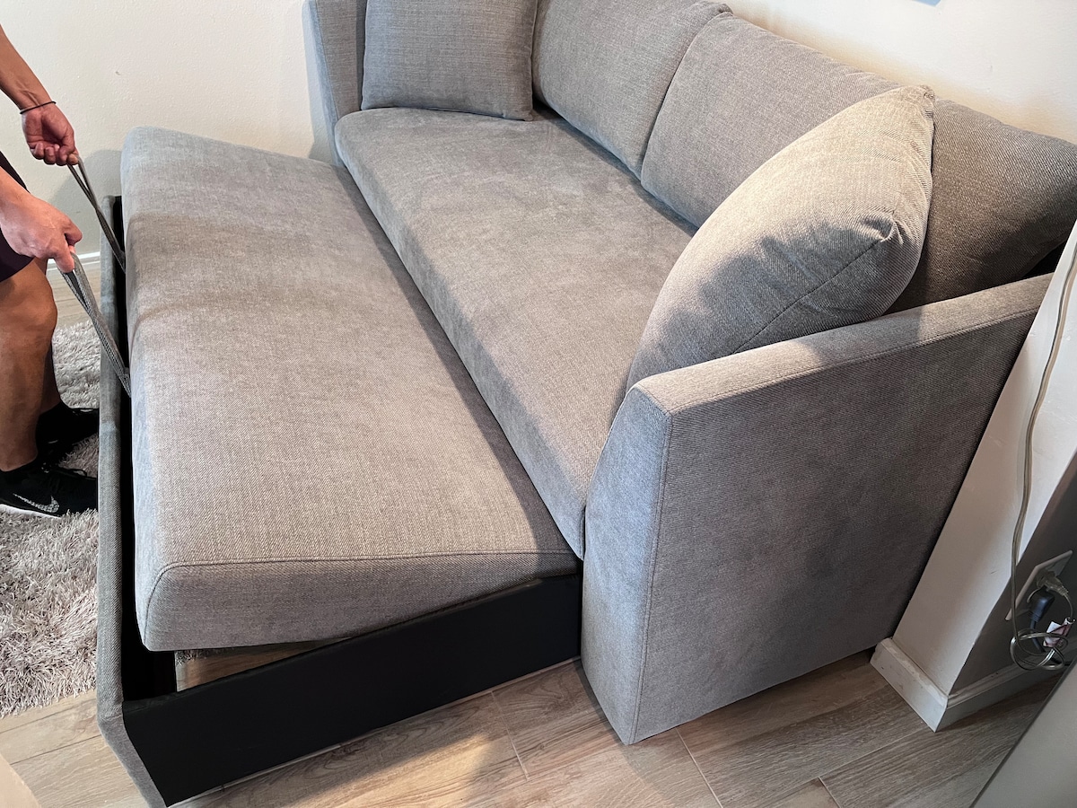 Nikmati dan bersantailah di studio kontemporer yang tenang dan luas ini. Menampilkan 1 kamar tidur Queen yang dapat menampung dua orang, 1 tempat tidur sofa yang berubah menjadi tempat tidur queen yang dapat menampung dua orang, ruang tamu/makan/dapur terpisah dengan meja dapur untuk menikmati makan malam atau menyelesaikan proyek kerja Anda. Kamar mandi desain hitam dan putih modern menantimu! AC yang sejuk, termasuk Wi - Fi, mesin cuci dan pengering. Terletak dengan mudah di West El Paso.