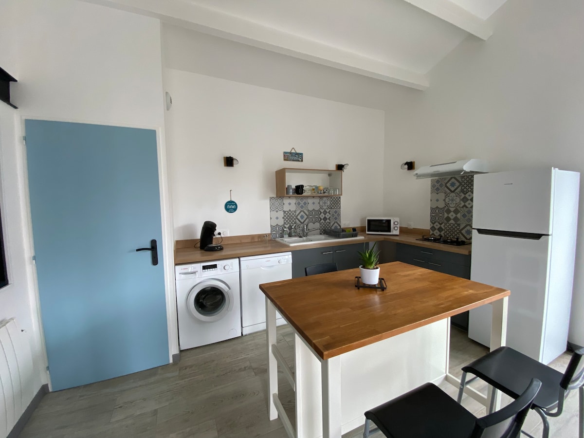 Bersantai di rumah yang tenang dan bergaya ini: ~ Tipe apartemen T2, terletak di pusat kota kecil Dompierre - sur - Mer (beberapa menit dari La Rochelle/Île de Ré dengan mobil) dan dekat dengan toko - toko dengan berjalan kaki (toko roti, apotek, tukang daging, pasar...) ~ Terdiri dari ruang tamu besar (ruang tamu/dapur/ruang makan), kamar tidur nyaman dengan kamar mandi terbuka, toilet terpisah dan pintu masuk independen ~ Kami tetap bisa dihubungi untuk membantu Anda mempersiapkan masa inap Anda