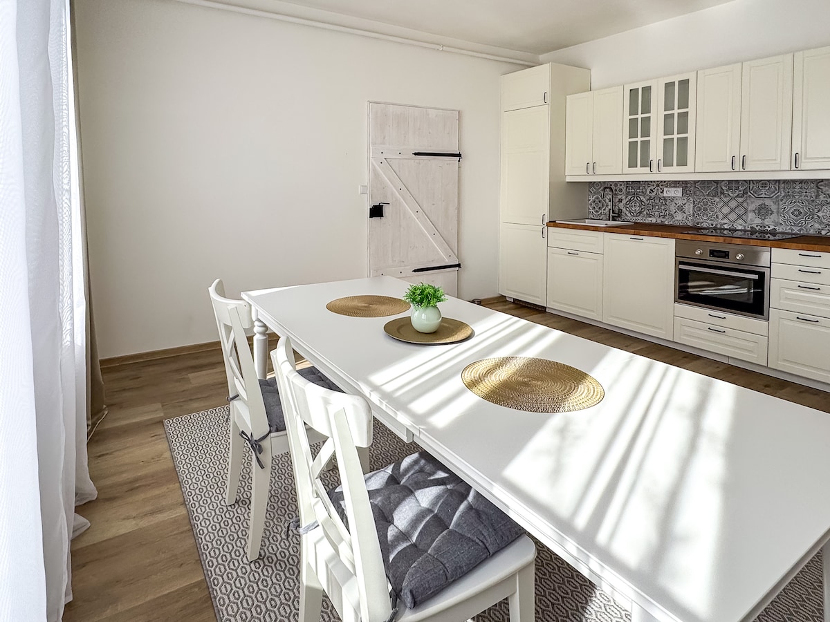 Anda akan dekat dengan segalanya saat menginap di apartemen yang damai ini. 5 menit berjalan kaki ke Pusat Kota! Apartemen 2 kamar tidur yang luas dengan ruang tamu ini akan terasa seperti rumah sendiri! Tempat tidur king size Amerika dengan kasur high - end, dapur lengkap dengan meja sarapan, WiFi 5G, kopi di rumah! Kamar sekunder memiliki 2 tempat tidur single dengan kasur Aloe - Vera dan meja rias. Ruang tamu yang luas menawarkan TV dan meja makan! Perlengkapan bayi/balita tersedia sesuai permintaan. Apartemen berada di lantai 2.