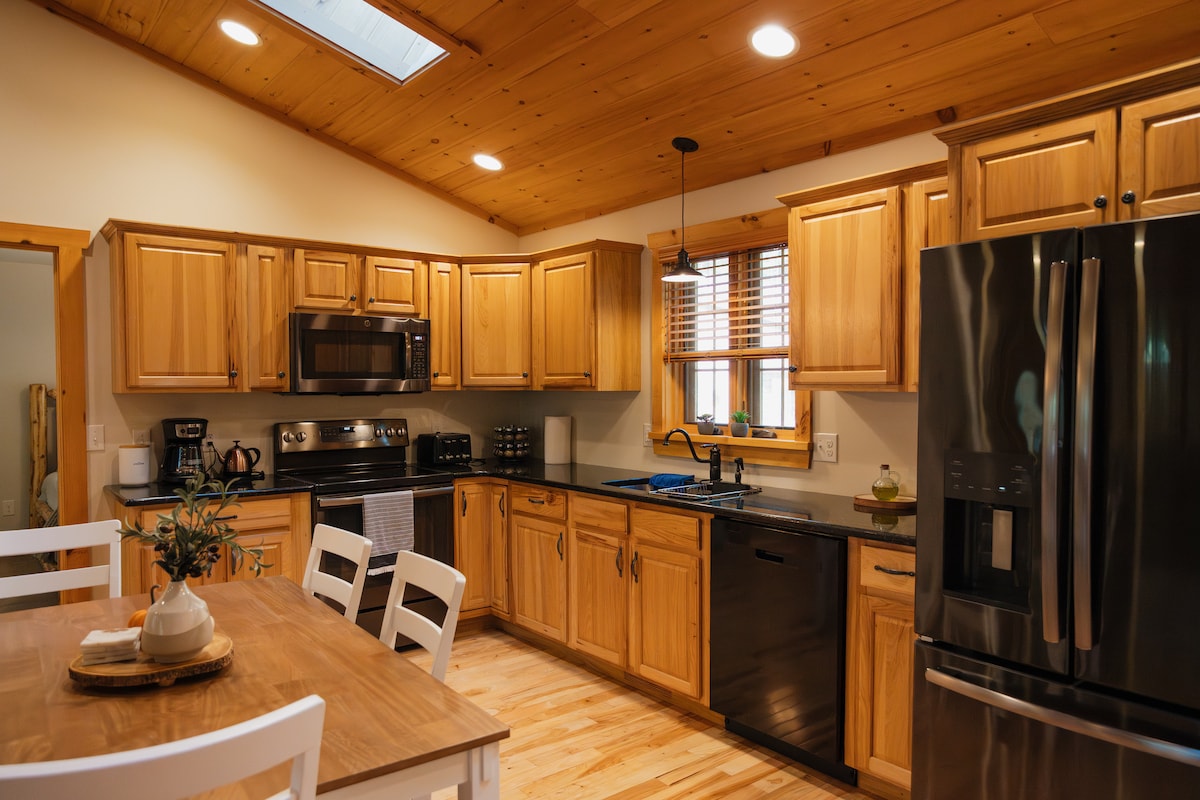 Suite tamu nyaman yang terhubung dengan rumah utama di desa kabin kayu. Dapur lengkap, area makan, kompor kayu, tempat tidur queen yang nyaman, lemari walk - in, permainan, 100 film. Pancuran walk - in & kursi built - in. Ruang laundry dengan area pintu ke dek, meja bistro, perapian. Ruang tamu berkubah ini memiliki kursi cinta untuk satu tempat tidur, TV [ROKU, You Tube TV, HULU, Netflix, Amazon, Disney], pemutar Blu - Ray, dan Google Nest Mini. Nikmati sarapan seperti telur segar, jus, susu, roti, kopi, teh, dan pizzelle buatan kami.