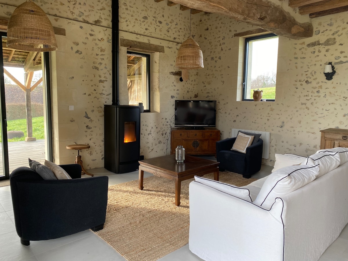 Pesona rumah Percher yang autentik: batu tua, ubin, balok, perapian besar. Di ujung dusun, menghadap ke selatan, tempat ini terbuka ke taman berhutan dan berbukit seluas 6500 m². Rumah ini mencakup 3 kamar besar, 2 kamar mandi, 2 toilet, dapur lengkap yang terbuka untuk ruang makan (meja 8 kursi dan bangku), ruang keluarga dengan perapian besar dan bar (nyaman untuk malam keluarga di dekat perapian atau pesta). Furnitur taman, barbekyu, plancha, ping pong,...