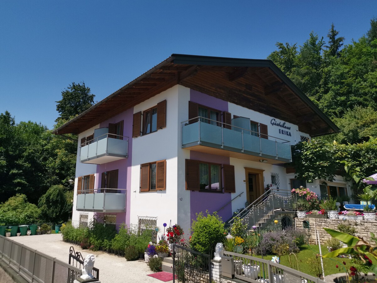 Kamar double dengan kamar mandi dalam dan balkon terletak di apartemen pribadi. Kamar tidur (18m²) dengan tempat tidur ganda, meja, kursi, kursi berlapis kain, kulkas . Kamar mandi mewah (8 m²) dengan kamar mandi, teras tenggara dengan pemandangan taman. hanya 10 menit naik sepeda ke danau, 10 hingga 15 menit berjalan kaki ke pusat kota Klagenfurt. Free WiFi. Sarapan opsional € 15 per orang. Parkir gratis tepat di depan rumah.