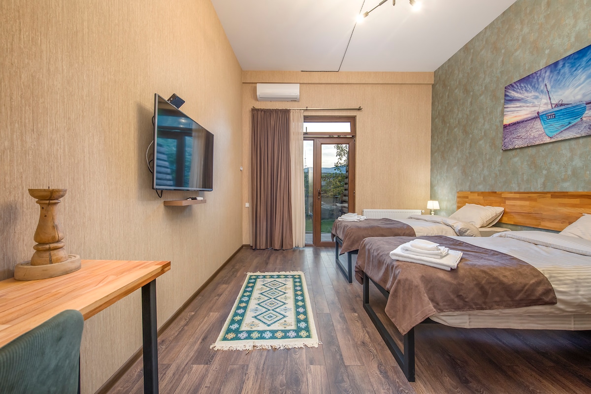 Kamar yang cerah dengan dua tempat tidur queen, ideal untuk keluarga kecil atau sekelompok empat orang. Termasuk kamar mandi pribadi dengan shower berjalan, Wi-Fi gratis, TV, brankas, kulkas mini, dan ketel listrik dengan kopi dan teh. Handuk, seprai, dan perlengkapan mandi baru disediakan. Dapur kecil bersama dan ruang kerja bersama tersedia. Kamar ini menghadap ke sisi belakang gedung. Terletak di pusat Vake. Check - in tanpa kontak