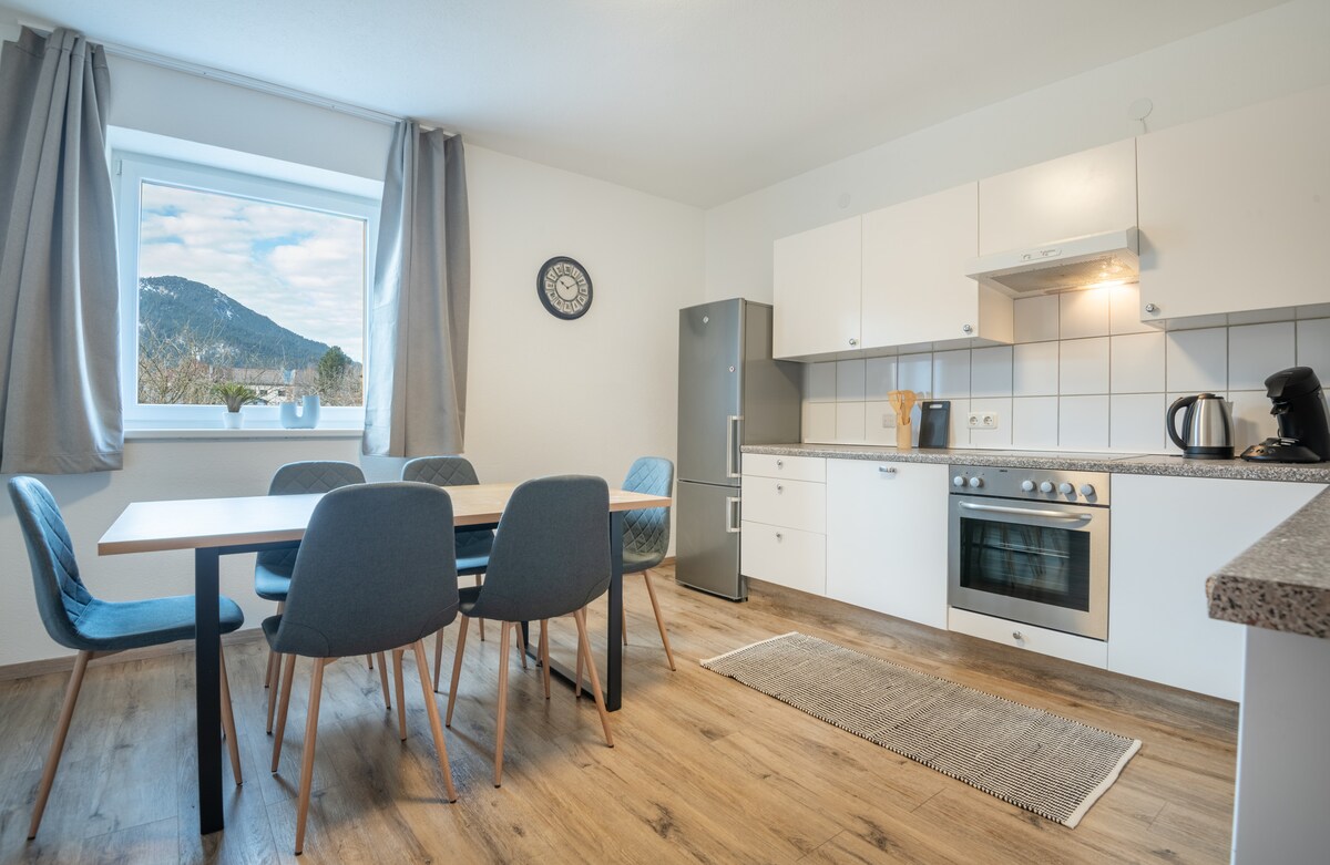 Apartemen loteng yang menawan & berperabot nyaman dengan langit - langit tinggi, balok terbuka, balkon menghadap barat yang cerah, perapian dan ruang tamu/ruang makan terbuka - keluarga cocok. Apartemen 80 meter persegi kami berlokasi di lingkungan yang tenang, tepat di bawah kastil dongeng King Ludwig II, Neuschwanstein dan menghadap kastel Hohenschwangau. Dalam 15 menit Anda berjalan kaki di Alpsee dan mendaki ke kastil. Banyak pendakian/ bersepeda yang indah dimulai dengan kami. Schwangau berjarak 2,6 km dari apartemen, sedangkan Füssen berjarak 4,2 km.