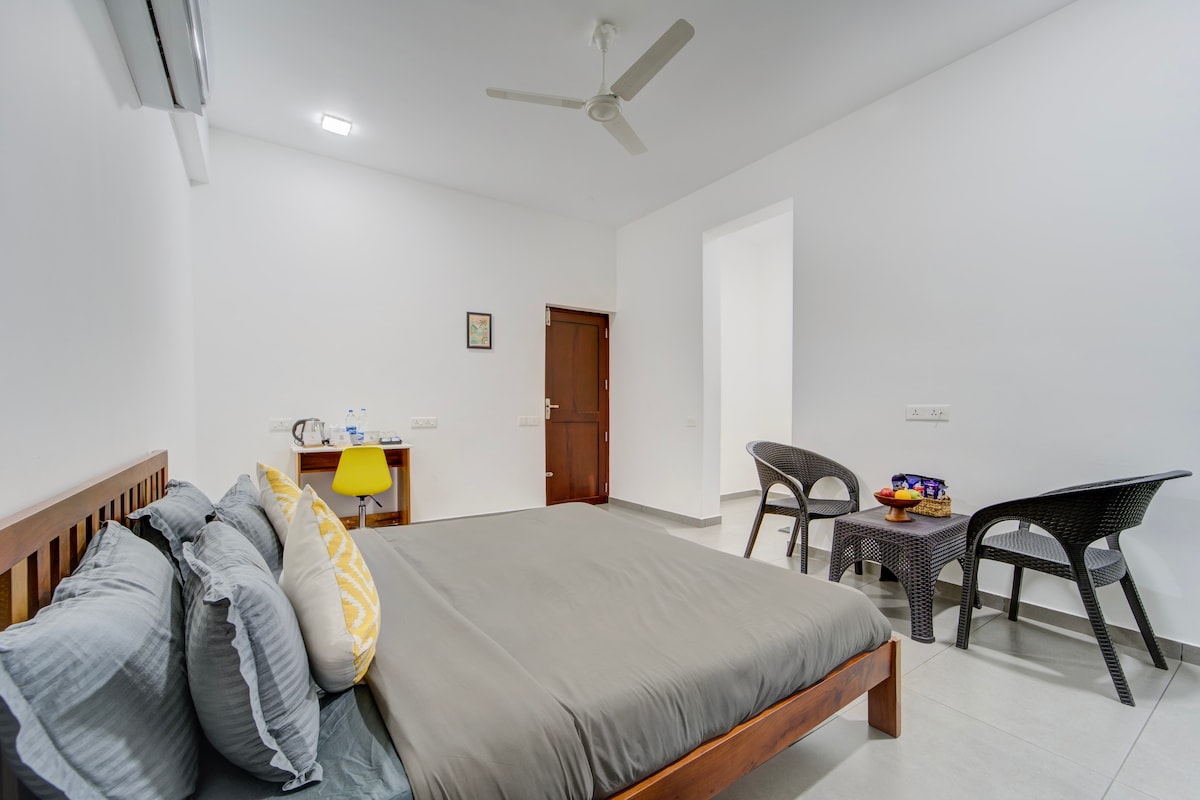 Selamat datang di tempat peristirahatan modern kami di jantung Alleppey! Tempat tinggal bergaya dan kontemporer ini menawarkan kamar luas yang menampilkan teras besar dengan pemandangan kota yang menakjubkan. Nikmati kemudahan air panas, AC, dan lift untuk kenyamanan Anda. Properti kami juga menawarkan check - in mandiri untuk pengalaman kedatangan yang mulus. Ini yang lebih kecil dari dua kamar kami yang diiklankan di Airbnb, lihat kamar lain di profil saya!