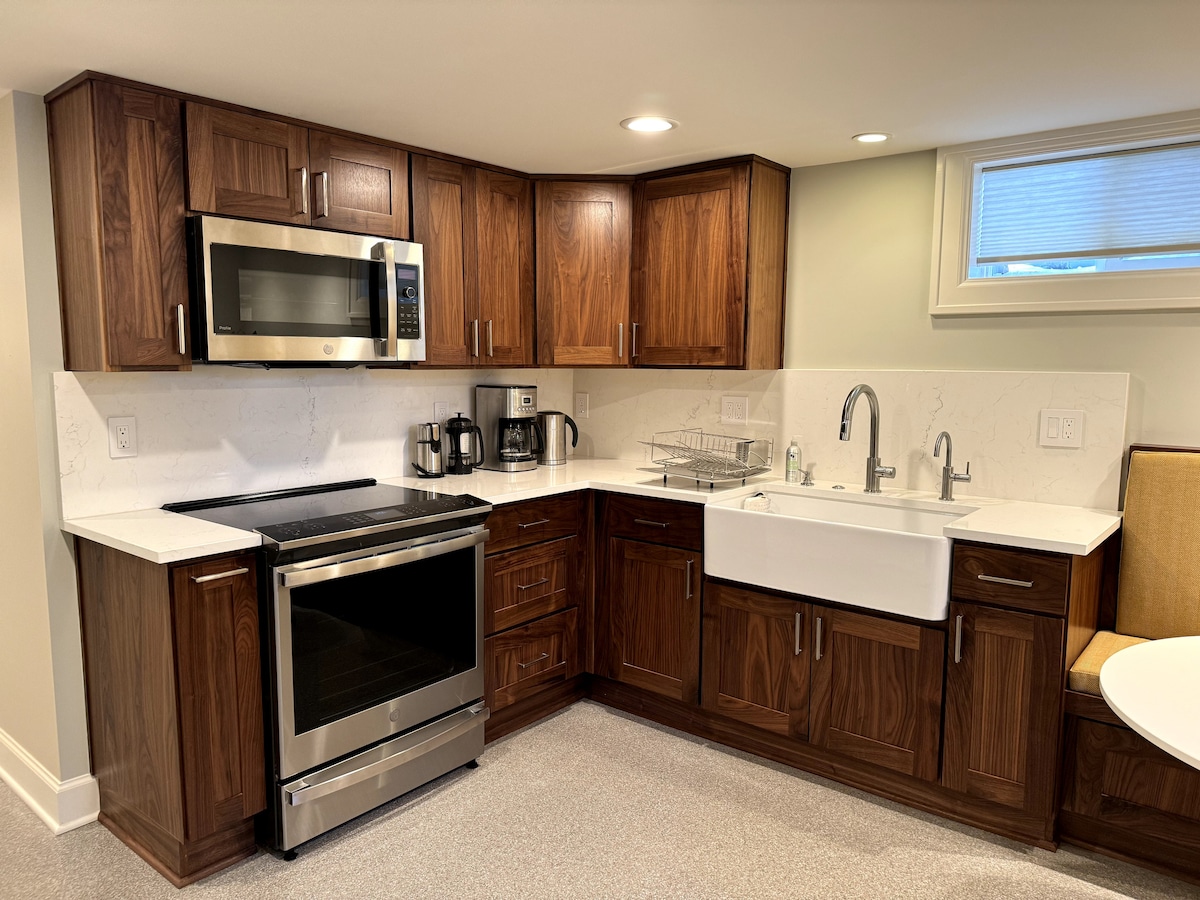 Selamat datang di studio 1.000+ kaki persegi kami yang baru direnovasi dan cerah dengan pintu masuk pribadi di lingkungan yang aman dan tenang. Anda masuk melalui tangga pendek ke tempat peristirahatan yang dirancang dengan cermat dengan dua tempat tidur king, teater fidelity tinggi, dapur lengkap, kamar mandi yang diperbarui, dan laundry. Nikmati parkir jalan masuk pribadi Anda, jalan kaki yang damai, jalur alam di bawah, dan kafe dan restoran di dekatnya.