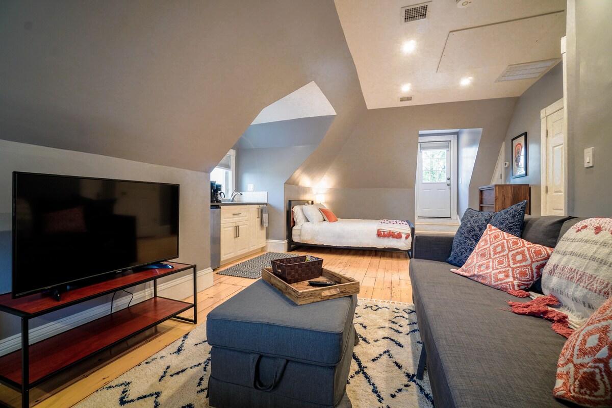 Newly renovated, open concept apartment in a private home located on a quiet residential street. Single, queen-sized adjustable bed, steam shower, and oversized bubble jet tub make this an ideal retreat for stress free relaxation. Includes off-street parking, full-size washer and dryer, and the use of both front and rear porches with seating in season. This apartment is great for couples or individuals looking to relax and get a break from their busy lives.