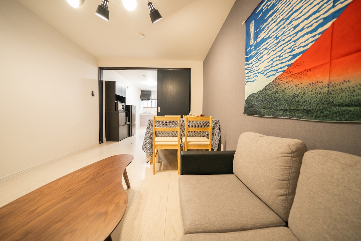 8 menit dari Shinsaibashi, 5 menit dari Dotonbori, dua kamar mandi dan dua kamar mandi, tempat yang terpisah dan didekorasi dengan baik