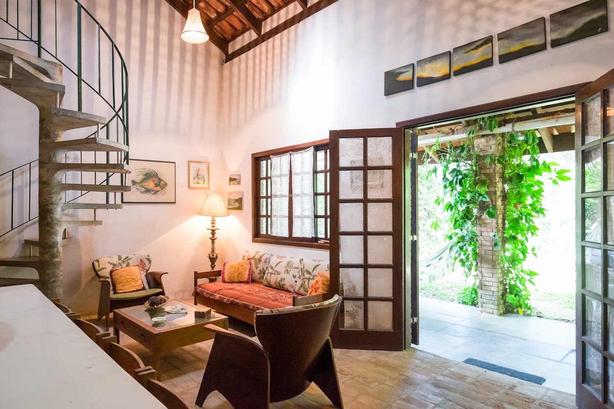 “Yang indah adalah gambaran dari undang - undang alam rahasia, yang, jika mereka tidak mengungkapkan diri kepada kami melalui keindahan, akan tetap tersembunyi selamanya." Johann W. von Goethe Menghadap teluk, rumah ini terletak setengah jalan ke atas bukit, di tengah hutan Atlantik, menawarkan pemandangan yang indah. Tempat ini memiliki arsitektur unik yang dirancang dengan cara terbuka untuk mengintegrasikan sepenuhnya dalam lingkungan alam yang istimewa. Udara segar menyerbu lingkungan sekitar dan menyampaikan nuansa kehadiran alam di setiap kamar.