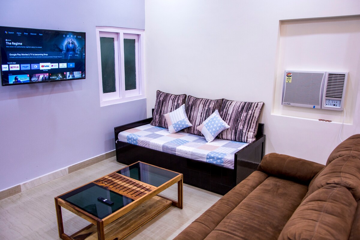 The Kovidara Tree: Ground-Floor 2BHK near Ram Mandir Is this what you are looking for? ✅ Elder Friendly : Ground floor, zero stairs for easy entry. ✅ Home Comforts : Fully equipped kitchen for your own meals. ✅ Peaceful Sleep : Quiet AC bedrooms away from city noise. ✅ Modern Living : Spacious hall with sofa set, hot water, and fast Wi-Fi. ✅ Total Privacy : Secure, professional space with 24/7 CCTV.