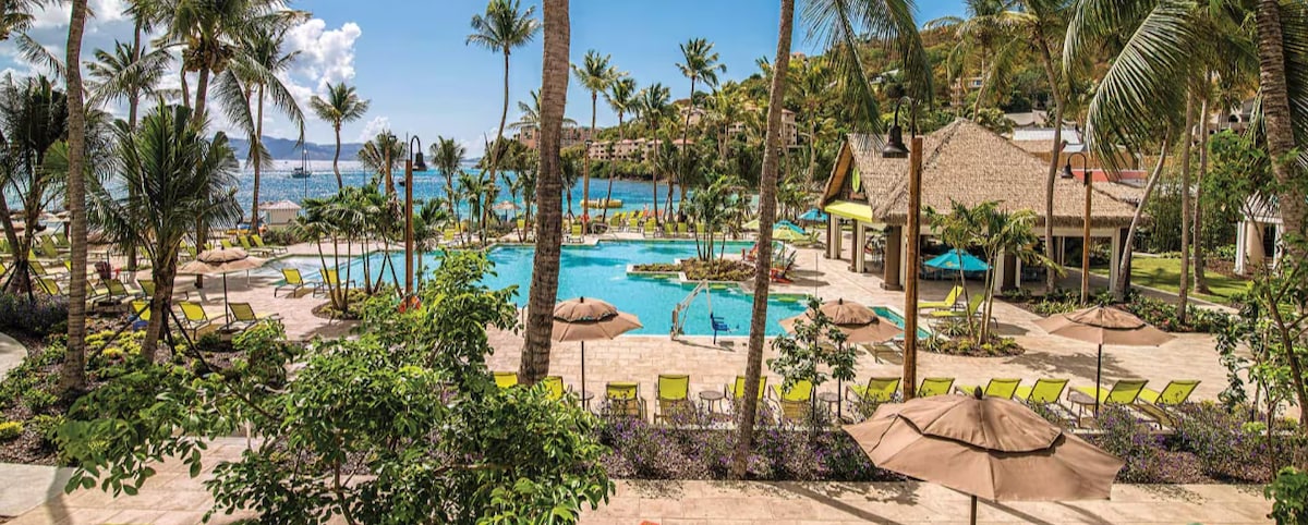 Resor ini, yang terletak di teluk yang dikelilingi pepohonan palem yang melambaikan tangan, adalah mimpi tropis yang sempurna. Jadi ambil kursi pantai, buka sandal jepit Anda, teguk minuman perahu yang lezat — dan biarkan pandangan Anda beristirahat di hamparan pasir putih halus, perairan sejernih kristal, dan pulau St. John di kejauhan. Harus berusia 21 tahun untuk check - in. Foto yang digunakan adalah foto stok. Mungkin bukan kamar yang tepat. Biaya resor dipungut saat check in.