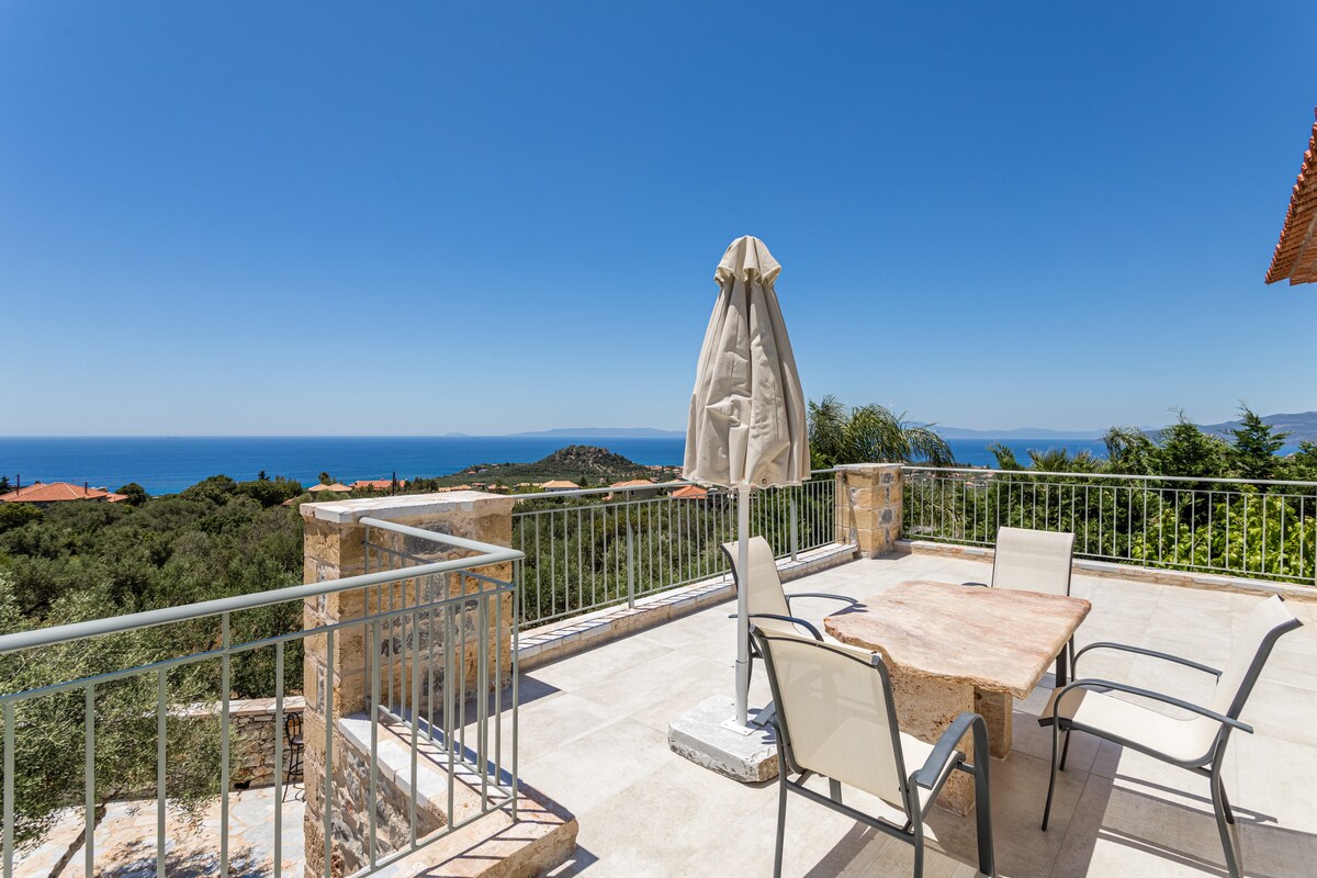 Lokasinya ideal, keduanya dekat dengan Kardamyli namun juga bersifat pribadi. Rumah tamu yang luar biasa di dua lantai dengan langit - langit katedral dan atap berkubah kayu yang terbuka. Dengan pintu masuknya sendiri. Ada area duduk dengan perapian dan sofa yang dapat menampung 1 -2 orang, dapur kecil, kamar mandi luas dengan pancuran, area makan, dan pintu keluar ke teras pribadi dengan pancuran luar dan area duduk. Lantai atas tempat tidur king size dengan pemandangan laut dan pegunungan yang spektakuler. Tempat yang unik dengan gaya tersendiri.