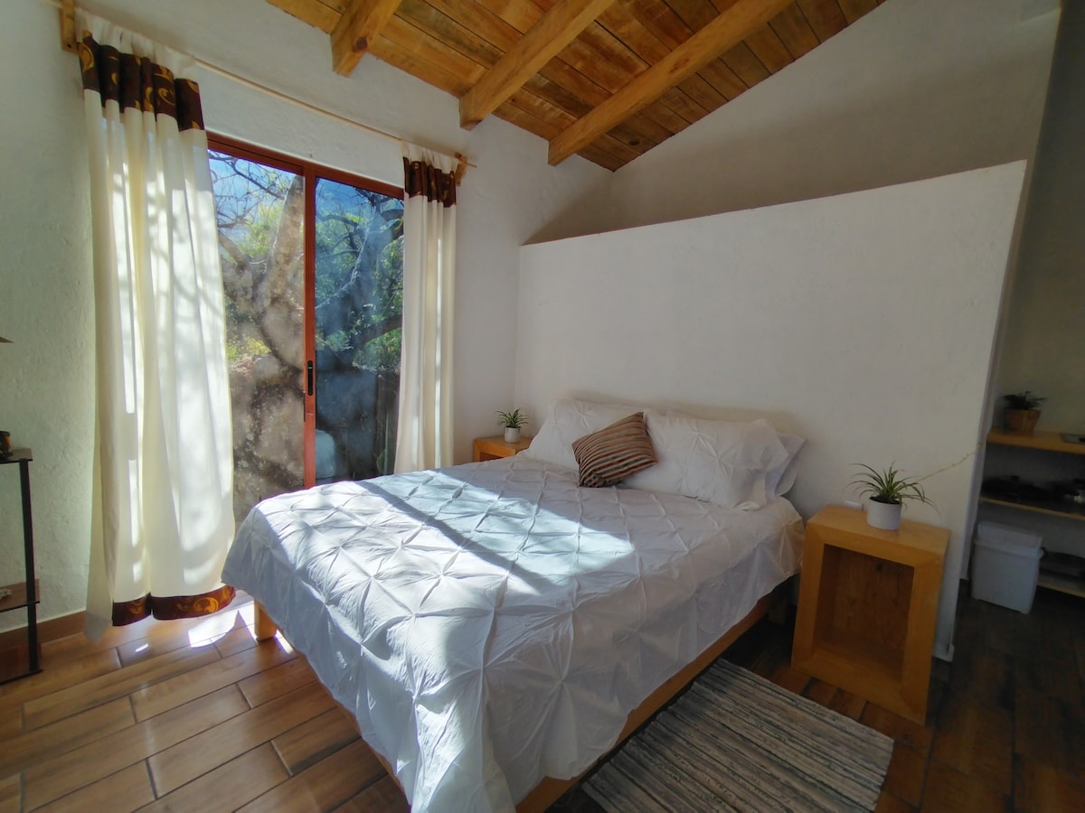 Bienvenido a Ixaya, un loft de lujo diseñado para ofrecer comodidad, privacidad y un ambiente de profunda relajación en medio de la naturaleza de Tepoztlán. Aquí encontrarás un refugio ideal para desconectar: cama King size, jacuzzi privado con calefacción (costo extra), cocina equipada, amplios ventanales y dos jardines exclusivos que llenan cada espacio de luz y serenidad. Ubicado en un fraccionamiento tranquilo y seguro, a solo 12 minutos del centro, podrás disfrutar de su energía única.