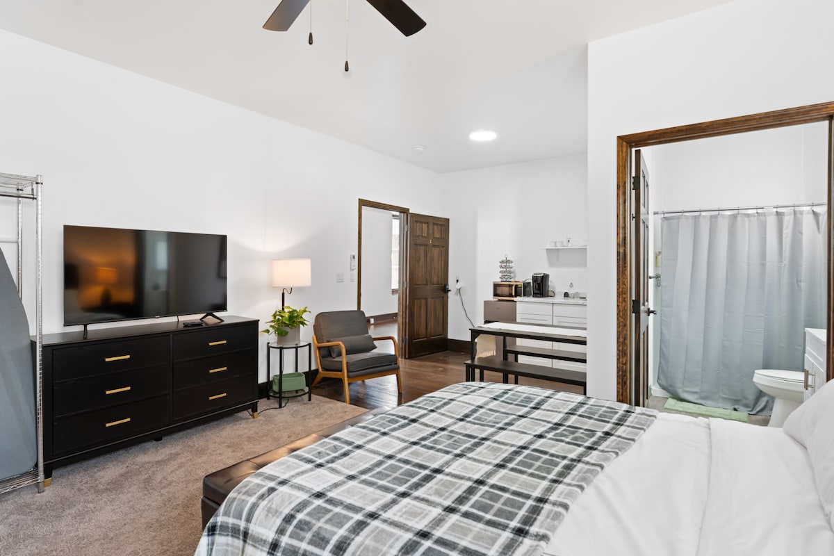 Apartemen #1 atau Apartemen #2? Pilihan ada di tangan Anda! Baik Anda bepergian sendiri, atau dengan seluruh kru... Downtown Clovis memiliki begitu banyak hal untuk dilihat & dilakukan! Suka berbelanja barang antik? Anda tidak perlu mencari jauh... "Bullet Bob's Has it All" di seberang jalan dari bar! Minggu-Kamis, Anda bisa menikmati masa inap yang tenang! Namun, ⚠️ Akhir pekan adalah waktu untuk menari sepanjang malam 🪩 (waktu tenang pukul 01.00!) Masa inap Anda meliputi: Tempat Tidur Queen Foam Memori tempat tidur tiup (atas permintaan) Ruang seni/Studio Yoga.