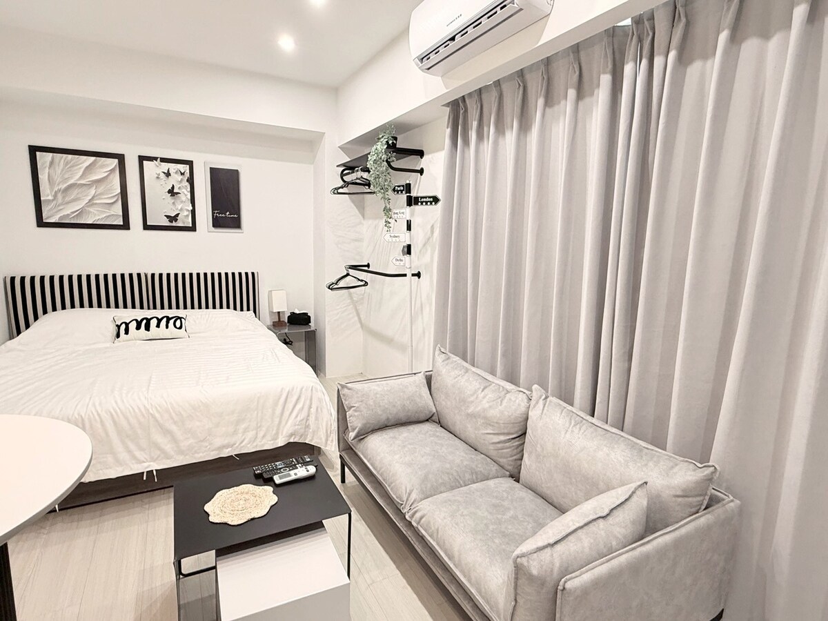 室內的灰白主色,配搭北美木紋銅色傢俱及家飾, 用心為您的居住空間提供沈靜優雅的感覺。日韓系電器的選用,不論是無線充電藍牙喇叭 ,大螢幕伸縮高清電視 ,都能滿足您對影音效果的要求。房源位於高樓內縮樓層,阻絕不必要的噪音並滿足您對景觀 ,安靜及隱私的要求。大樓並配有全天候警衛,住戶專屬電梯 ,公用大露台 ,以及地下收費停車場, 位處西門町核心路段,無論搭乘捷運或自駕都非常方便。Desain interior berbasis nada bumi menawarkan suasana yang hangat, tenang, penyembuhan, dan menyenangkan. Fasilitas kamar, termasuk tempat tidur ganda, kamar mandi dalam dengan shower enclosure, AC, smart 4K TV dengan film/Netflix, internet WIFI, pencahayaan teluk dan pemutar musik dengan koneksi nirkabel & port pengisi daya USB.