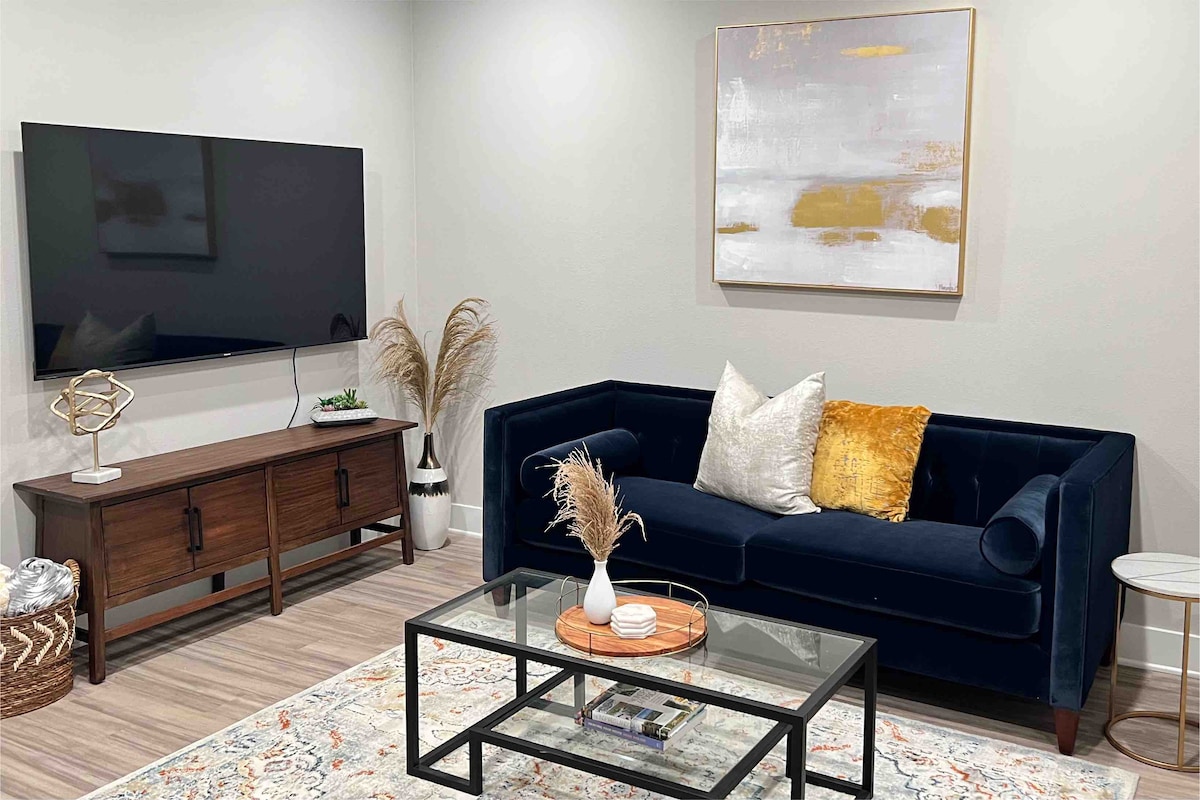 AMAZING 1 KiNG Bed 1 Full Bath apartment/condo. Sekitar 780 kaki persegi. Tempat tidur yang nyaman dan kokoh. Tidur 2 orang dengan nyaman, tidur di sofa bersifat opsional. Ruang tamu memiliki Smart TV 65" dan sofa besar. Dapur lengkap, pulau dapur bergerak, konsep terbuka dengan segala yang Anda butuhkan untuk masa inap jangka pendek atau panjang. Dek pribadi. Mesin cuci/pengering di unit. Selalu Bersih dan siap tepat waktu.