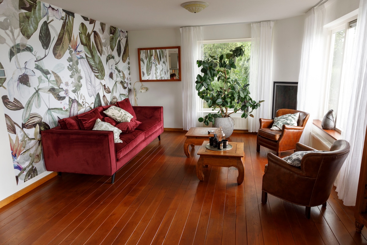 Comfortable villa in a green wetland area, with large garden and three bedrooms. Ideal for nature lovers, families and groups! Complete with bikes, fast wifi, wood stove, airco and parking. The beds are made and there are plenty of towels. The kitchen is fully equipped and everything is stocked. Please note that our house is in a nature reserve: YOU'LL NEED A CAR